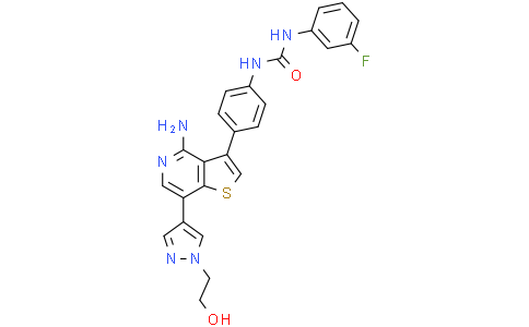 Ilorasertib (ABT-348) 是一种有效、ATP 竞争性的多靶点激酶抑制剂,可抑制 Aurora C,Aurora B 和 Aurora A 的活性,IC50 值分别为 1 nM,7 nM 和 120 nM。Ilorasertib 同时抑制 RET,PDGFRβ 和 Flt1 的活性,IC50 值分别为 7 nM,3 nM 和 32 nM。