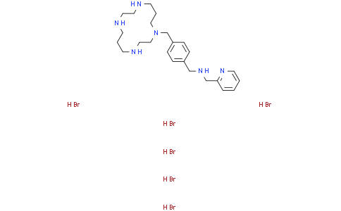 AMD 3465 hexahydrobromide (GENZ-644494 hexahydrobromide) 是一种有效的 CXCR4 拮抗剂,在 SupT1 细胞中,能够抑制 12G5 mAb,CXCL12AF647 与 CXCR4 的结合,IC50 值分别为 0.75 nM 和 18 nM;AMD 3465 同时可有效抑制 X4 HIV 的复制 (IC50,1-10 nM),但对 R5 HIV 病毒无作用。