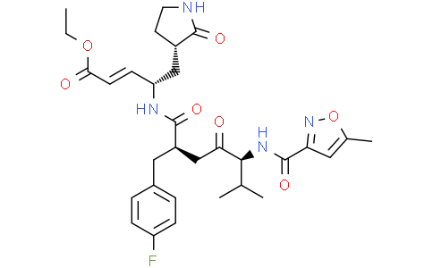 Rupintrivirvr (AG7088),抗病毒药,是一种有效,选择性和不可逆的人类 rhinovirus (HRV) 3C protease 抑制剂。在 H1-Hela 和 MRC-5 细胞保护试验中,Rupintrivirvr 抑制48种不同HRV血清型的复制,平均 EC50 为 0.023 μM。Rupintrivirvr 具有免疫调节作用。