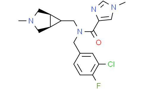 PF-03463275 是一种中枢神经系统渗透性、具有口服活性、选择性、竞争性甘氨酸转运蛋白-1 (GlyT1) 可逆抑制剂,Ki 为 11.6 nM。PF-03463275 有可能用于精神分裂症的研究。