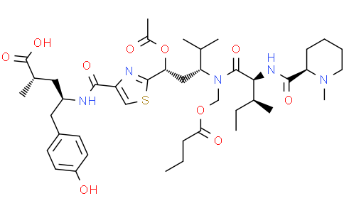 Tubulysin B 是一种高度细胞毒性的肽,有效的微管去稳定剂,是从粘细菌 Archangium geophyra 和 Angiococcus disciformis 中分离的。Tubulysin B 抑制许多癌细胞系,包括具有多药抗性的细胞系,IC50 值在皮纳摩尔范围内。Tubulysin B 是一种具有细胞毒性活性微管溶素,抑制微管蛋白聚合并导致细胞周期停滞和凋亡。