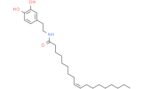 N-Oleoyldopamine (OLDA) 是油酸和多巴胺 (DA) 缩合的产物,是一种内源性的 TRPV1选择性激动剂。N-Oleoyldopamine 可以穿过血脑屏障。N-Oleoyldopamine 通过激活 TRPV1 保护心脏免受缺血再灌注损伤。