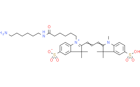 Sulfo-Cy3 amine 是带有胺基团的 Cyanine 3 (Cy3) 染料衍生物。磺酸根离子增加了化合物的水溶性,使其适用于水性溶液。Cy3 是一种荧光染料,荧光光谱通常在绿色至橙色的波长范围内。Sulfo-Cy3 amine 的胺官能团可以与羧基反应,形成共价键。Sulfo-Cy3 amine 能够与蛋白质、抗体等生物分子结合,追踪它们在生物样品中的位置和动态变化。