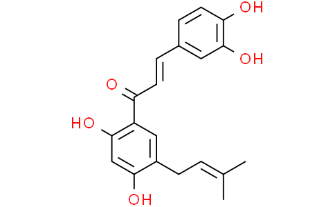 Broussochalcone A 是一种抗氧化剂和黄嘌呤氧化酶抑制剂 (IC50=2.21 μM),具有自由基清除活性。Broussochalcone A 抑制铁诱导的脂质过氧化,抑制脂多糖 (LPS) 激活的巨噬细胞中的一氧化氮 (NO) 的合成。Broussochalcone A 还通过提高 ROS 水平和激活 FOXO3 信号通路诱导人肾癌细胞凋亡 (Apoptosis)。