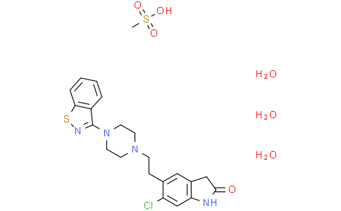 Ziprasidone (CP-88059) mesylate trihydrate 是一种具有口服活性的 5-HT 和多巴胺 (dopamine) 受体拮抗剂。Ziprasidone mesylate trihydrate 对大鼠 D2 (Ki=4.8 nM)、5-HT2A (Ki=0.42 nM) 和 5-HT1A (Ki=3.4 nM) 有亲和作用。