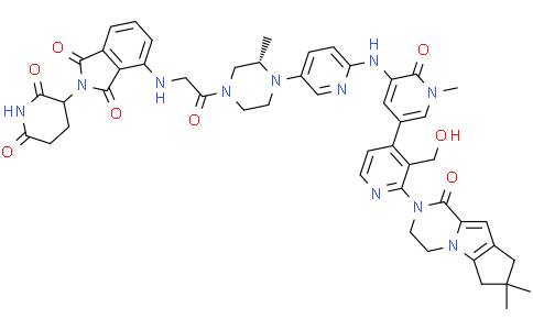 PTD10 是一种高效的 PROTAC BTK 降解剂 (DC50: 0.5 nM,KD: 2.28nM)。PTD10 在 Ramos 和 JeKo-1 细胞中降解 BTK,DC50s 分别为 0.5 和 0.6 nM。PTD10 抑制细胞生长,并通过激活 caspase 依赖性途径和线粒体途径诱导细胞凋亡 (apoptosis)。PTD10 可用于 B 细胞失调的研究。