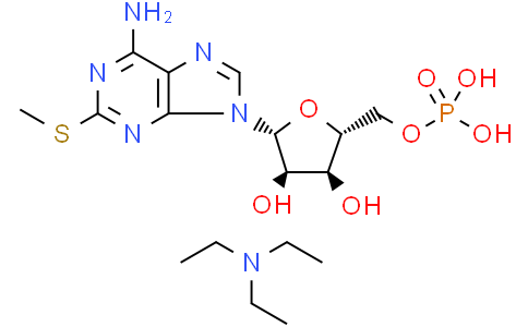 2-Methylthio-AMP diTEA 是一种选择性、直接的 P2Y12 受体拮抗剂,通过阻断 ADP 与 P2Y12 的结合,抑制 ADP 依赖的血小板聚集,而对 P2Y1 或其他嘌呤受体无明显作用。