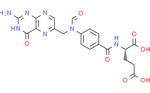 10-Formylfolic acid 是叶酸的一种氧化型衍生物,是一种强效二氢叶酸还原酶 (DHFR) 抑制剂,可能在细胞内发挥调节作用。