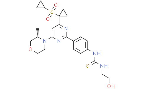 AZD3147 是一种高效、选择性 mTORC1/mTORC2 双重抑制剂,通过同时阻断 mTORC1 和 mTORC2,抑制下游 S6K、Akt 等关键信号节点,从而干扰细胞增殖与存活。AZD3147 对 PI3K 也具有一定的选择性作用。