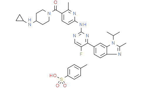 Cimpuciclib tosylate 是一种高选择性 CDK4 抑制剂,IC₅₀ 为 0.49 nM。Cimpuciclib tosylate 阻断 CDK4/cyclin D 复合物,导致 Rb 蛋白低磷酸化,促使细胞周期停滞于 G1 期,从而抑制肿瘤细胞增殖。
