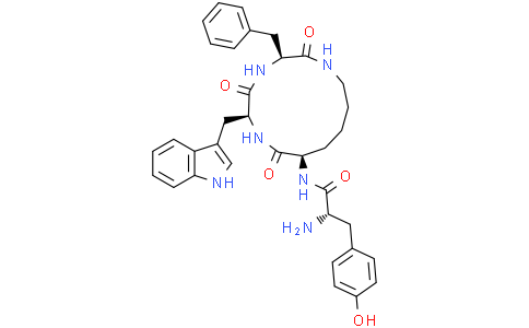 CYT-1010 是一种人工合成的内吗啡肽-1 (endomorphin-1) 环肽类似物,是高选择性 μ-阿片受体 (MOR) 激动剂。CYT-1010 对 β-arrestin 招募的 EC₅₀ 为 13.1 nM,对 cAMP 生成的抑制 EC₅₀ 仅 0.0053 nM。