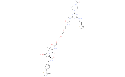 C004019 是一种靶向 tau 蛋白的小分子 PROTAC 降解剂,能透过血脑屏障。C004019 能够同时招募 tau 蛋白与 E3 泛素连接酶 (Vhl),从而选择性增强 tau 的泛素化及蛋白酶体降解。C004019 可用于阿尔茨海默病 (AD) 及 tau 蛋白相关神经退行性疾病的药理研究。