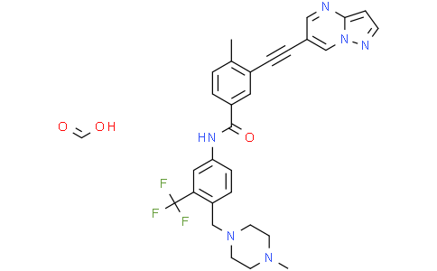 GZD856 formic 是 GZD856 的甲酸盐 (formic acid salt),是一种口服有效的小分子激酶抑制剂,主要用于抗肿瘤研究。GZD856 formic 是双重激酶抑制剂,抑制 PDGFRα/β 的 IC50 值分别为 68.6 和 136.6 nM。GZD856 formic 也是 Bcr-AblT315I 的抑制剂,对天然 Bcr-Abl 和 T315I 突变型的 IC50 值分别为 19.9 和 15.4 nM。