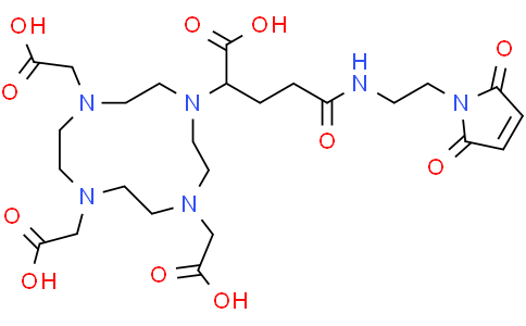 DOTA-GA-maleimide 是一种双功能大环螯合剂,专门用于靶向含巯基 (-SH) 的生物分子。DOTA-GA-maleimide 通过 maleimide 与蛋白质巯基特异性结合,DOTA 大环与放射性金属离子 (如 111In) 形成稳定配位复合物,从而实现蛋白质的放射性标记。DOTA-GA-maleimide 可用于 MMP 活性相关癌症的 SPECT 成像研究。